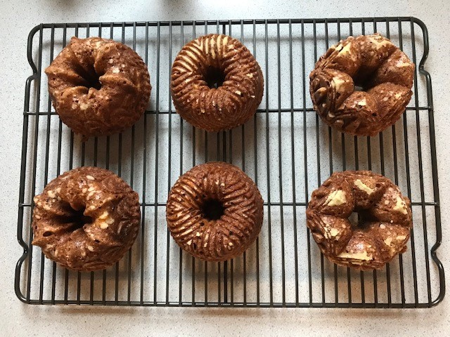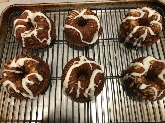 As you might guess, Howard doesn’t eat bananas at all, not even in cake. I’m not currently comfortable about the safety of sharing food I prepare with people outside my house, and the last thing I want to do is eat an entire cake by myself. So, in the interest of minify-ing, I divided by the eggs and made half the batter. Many years ago, I bought a mini-Bundt pan that’s never been used. This was the perfect occasion for its maiden bake. For fun, I followed through with the icing. My milk had soured, so I used cream instead. It took quite a bit to make the icing thin enough to drizzle. I wasn’t so artistic with that.