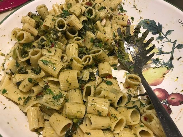 Dorie recommends using pasta that’s a similar size to the shrimp, so I chose mezze rigatoni. Howard has placed zucchini and summer squash on the “taboo” list at our house, plus they’re out of season, so I substituted broccoli rabe, which I cut into 2-inch lengths and blanched first. I also used a few tablespoons of diced sun-dried tomatoes instead of fresh ones. For herbs, Dorie’s recipe lists dill and chives. I already had a mixture of chopped dill, parsley and minced garlic to garnish a fish soup I made, so I used up the rest to top the pasta.