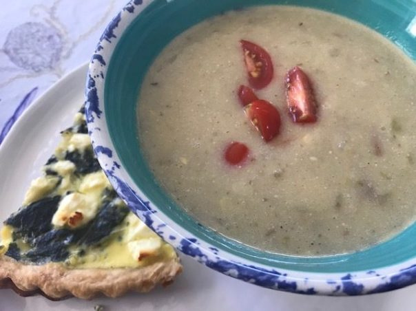 The genius of this recipe is to cook half the vegetables in broth until tender and then puree them to make the base. It’s perfectly creamy, without any cream. The other half of the vegetables are sautéed in the fat remaining from cooking a few slices of bacon (OK, maybe not so healthy) and added to the puree. I didn’t even think the bacon was key to enjoying the soup, so it could easily be omitted. The only truly fussy part (which wasn’t a big deal) was fishing out half the potatoes before pureeing.