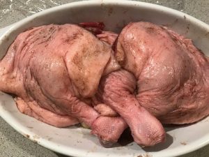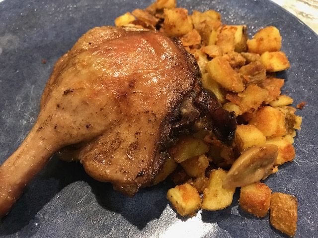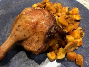 I didn’t pick the right baking dish. David wants the legs to be snug. I had one pan where the legs fit snugly, but not really in one layer. In the next bigger pan, the legs had more room, not what I’d call snug. I opted for the smaller dish, but I think that was a mistake. The parts of the legs that were immersed in the fat melted off the bone. The other parts were tasty, but just not as tender. I think the trick is for all the legs to lie flat so they all can bathe in the duck fat, but with minimal extra room so that fat is as deep as possible.