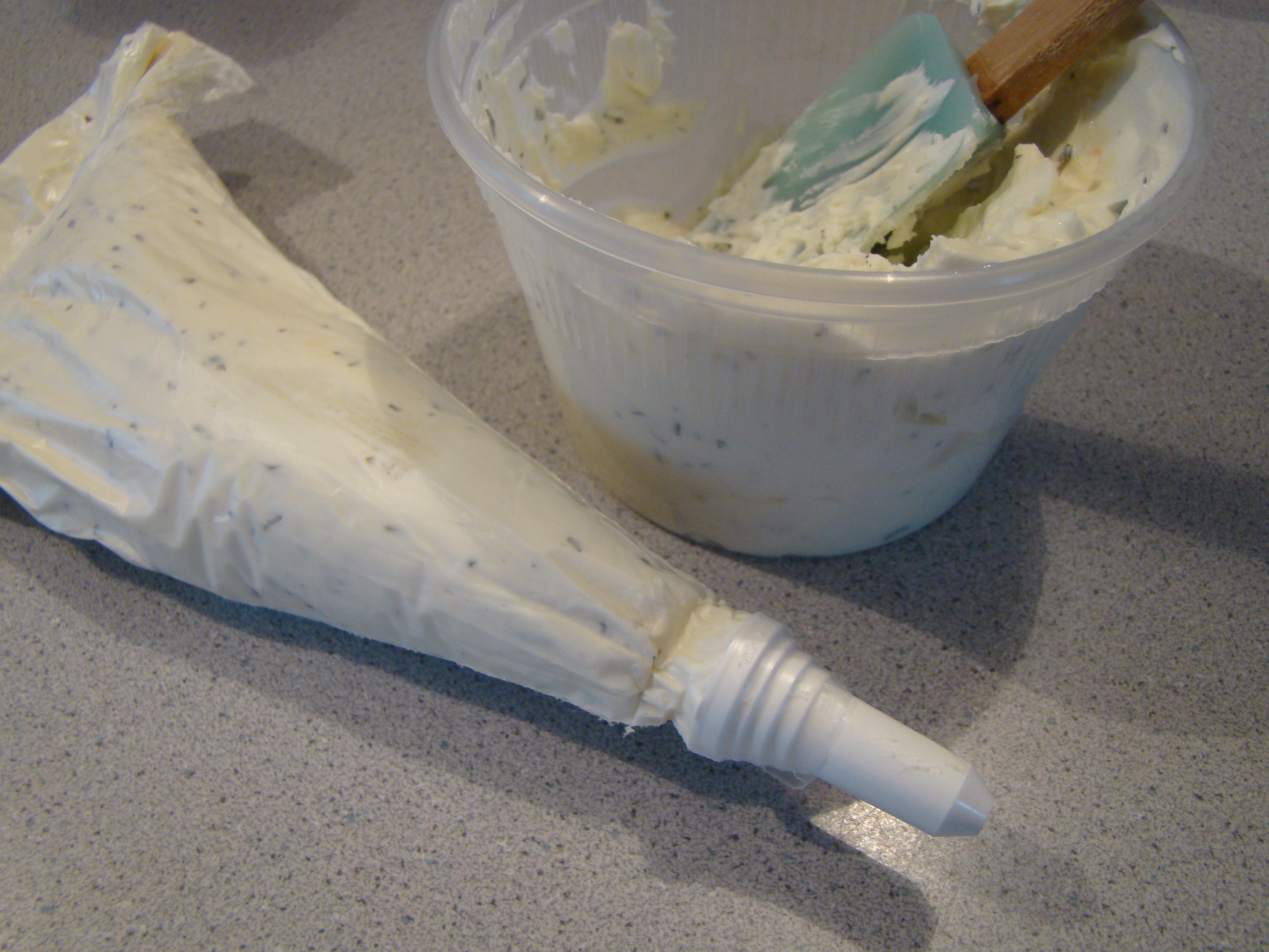 I didn’t read the recipe well before I went shopping, so I bought plain goat cheese instead of herbed. No problem. I added a teaspoon of dried herbes de Provence when I mixed the chèvre with cream cheese and cream.
