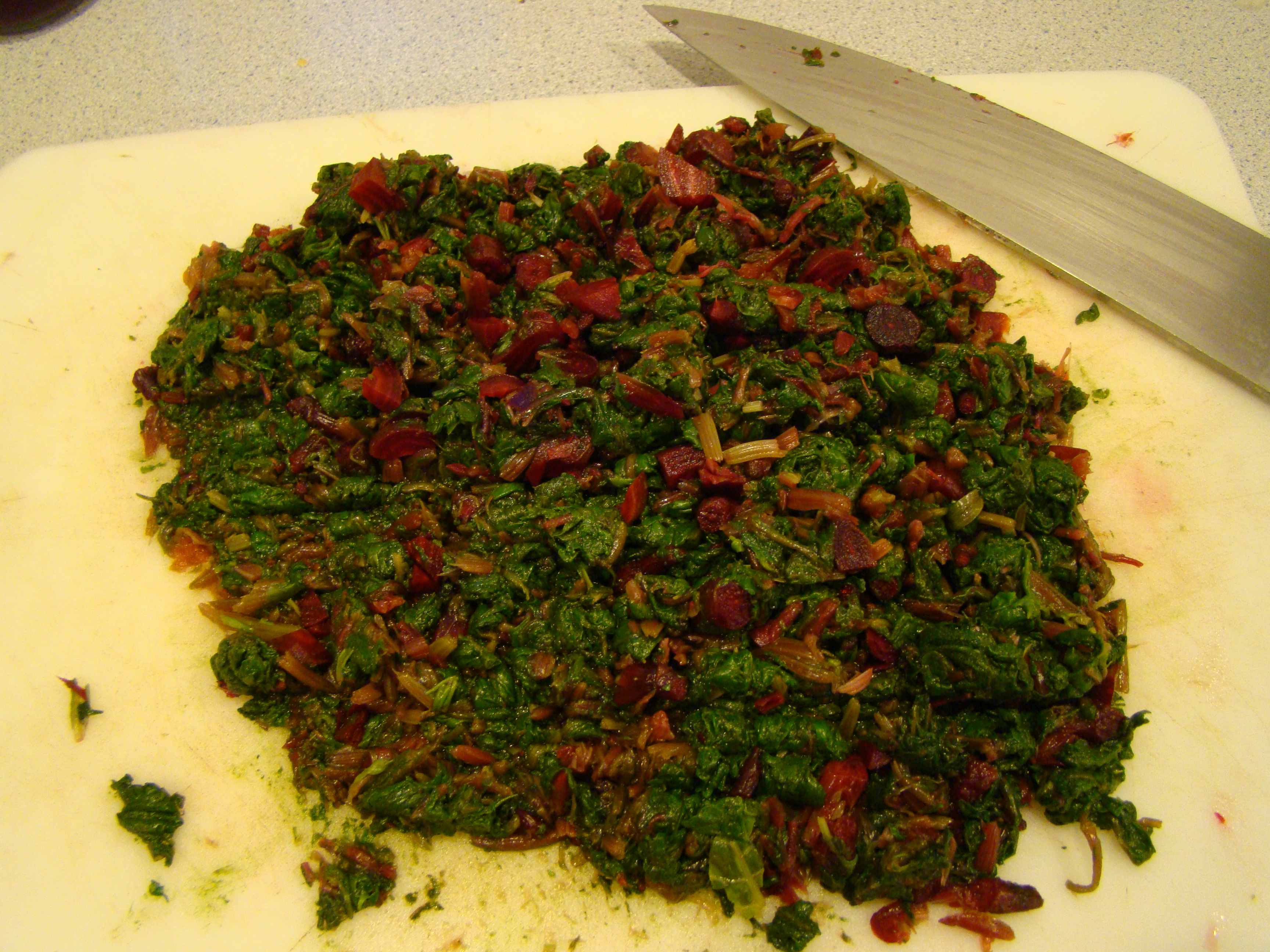 This spanakopita starts with frozen spinach. The recipe specifies whole leaf spinach. I’m not sure why it doesn’t call for the chopped variety because after defrosting, you coarsely chop the spinach anyway. Having made this once, I would buy chopped spinach next time. The spinach is combined with onions, cumin seed, and thyme that have been sautéed together, plus some egg for binding. Two layers of spinach separated by a layer of crumbled goat cheese and toasted pine nuts are topped with puff pastry and popped into the oven. I always have problems rolling out store-bought puff pastry after it gets unfolded, so, as crazy as it seems, I make my own “rough puff” and use that instead. It’s actually easier for me.