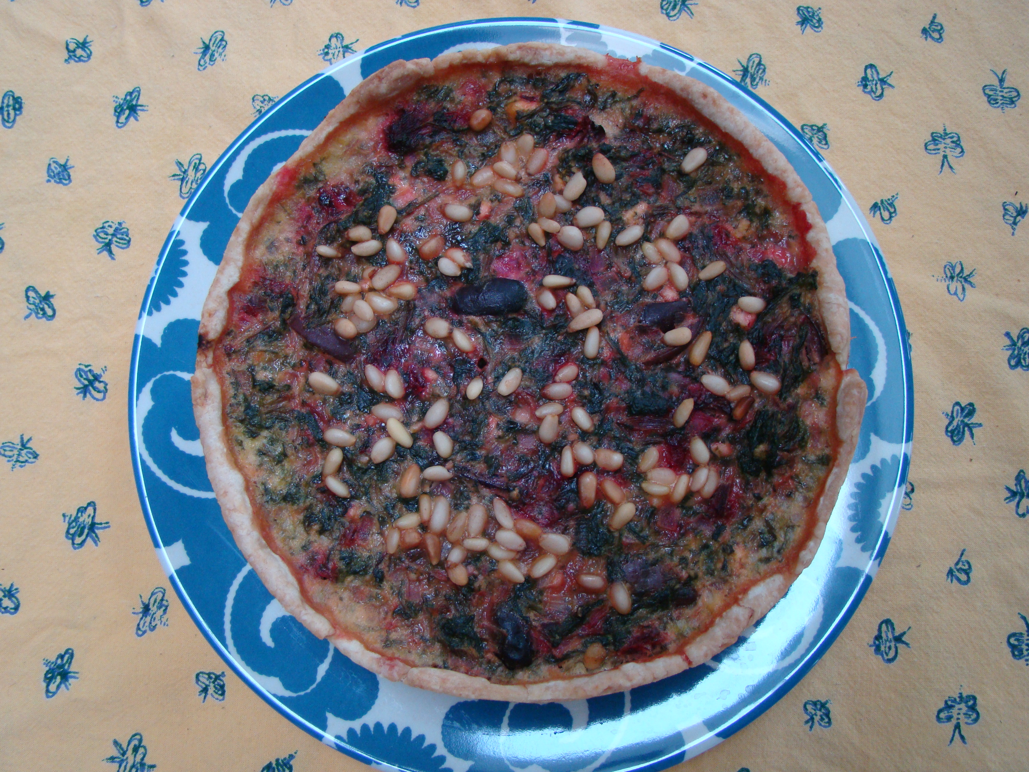 Second thing: Of course, it has to be food related. I picked up a huge bag of beet greens at the farmstand in Maine and was inclined to make a quiche. A tour of the fridge indicated something Greek inspired was the way to go. I combined sauteed greens with feta cheese and olives. I baked the crust in a springform pan, making the sides higher than the typical removable-bottom quiche pan. It made a nice, solid, tart; perfect for lunch with a salad. It had a funny pink tinge from the beet greens, but the flavors were delicious. I can’t wait to make it again.