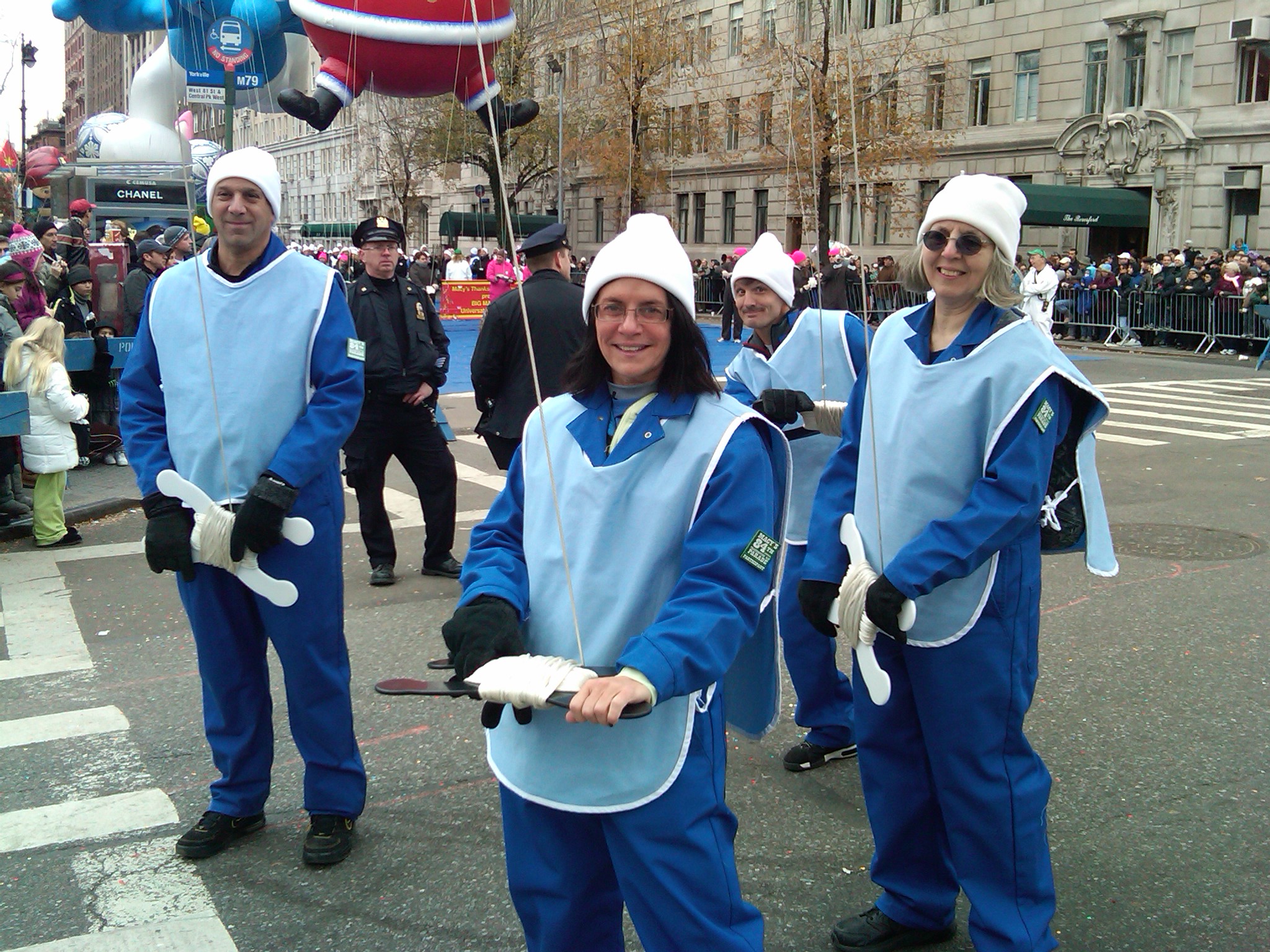 Howard’s sister was a balloon handler in the Macy’s Thanksgiving Day parade this morning. We caught a glimpse on TV of the Pillsbury Doughboy balloon she was holding, but the TV camera shot didn’t include her. (I love the outfit!)