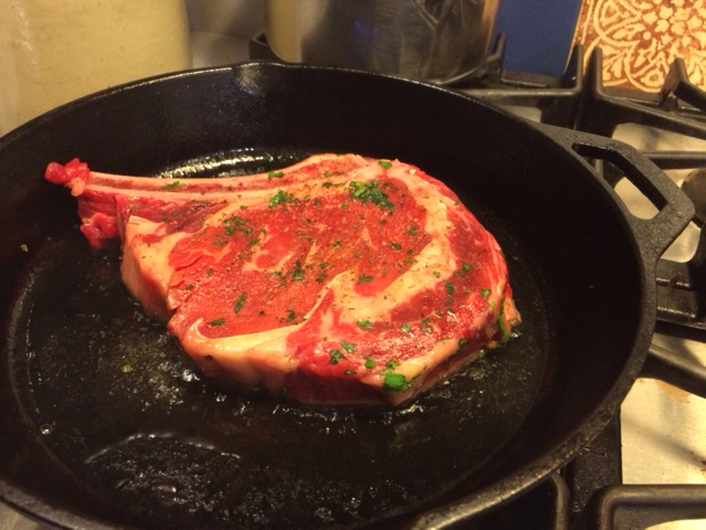 Meanwhile, rib-eye steak is seasoned with smoked salt, chipotle pepper and fresh parsley, then seared to perfection in a cast-iron pan. The piping hot steaks are served with dollops of compound mustard butter, made with both Dijon and dry mustard powder. To round out the meal, I made this delicious recipe for tahini-roasted broccoli from Food52.