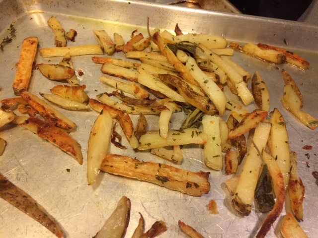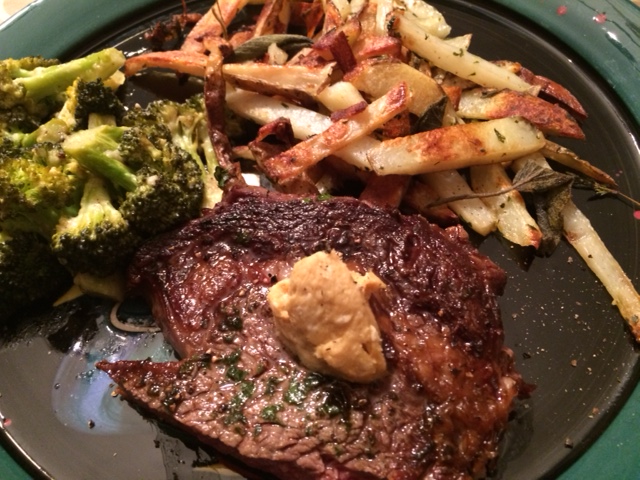 This week’s recipe from David Leibovitz’s My Paris Kitchen offered the perfect idea for a romantic dinner for two. Steak Frites au Beurre de Moutarde – in English, Steak with mustard butter and French fries. Because I’m scared of deep-frying, I was wary of the accompanying French fries, but upon reading the recipe, learned they were oven fries. Russet potatoes are cut in to French-fry-sized batons, tossed with olive oil, kosher salt, and fresh herbs, then baked until crispy.
