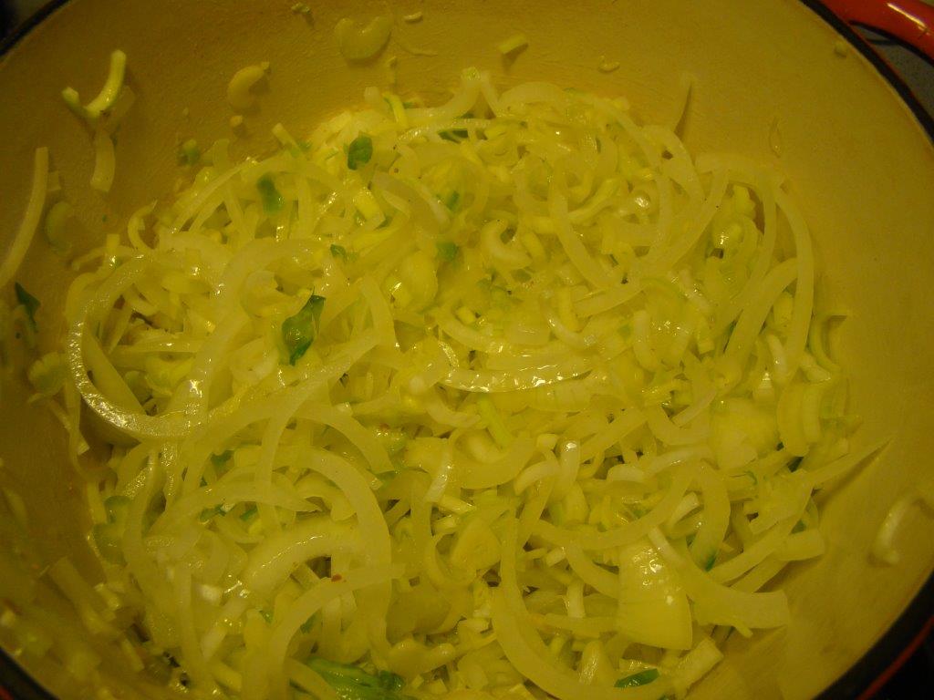 The soup starts off by sautéing a pile of ivory and pale green vegetables (onions, garlic, leek and celery) in butter. Once the vegetables are soft, chunks of Jerusalem artichokes get added and sautéed some more. The chokes were supposed to soften after 15 minutes before the chicken broth gets added. Mine were not soft, but I assumed the long simmer in broth that followed would fully cook them. I was right. The final step is to process the soup in the blender for a smooth puree.