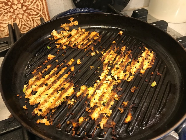 I sautéed the first batch of burgers in a non-stick cast-iron grill pan where it stuck in all the grooves. That happens with everything I cook in that pan, not sure why. For the second batch, I switched to my cast-iron skillet with much better results — more surface area to sear plus no sticking.