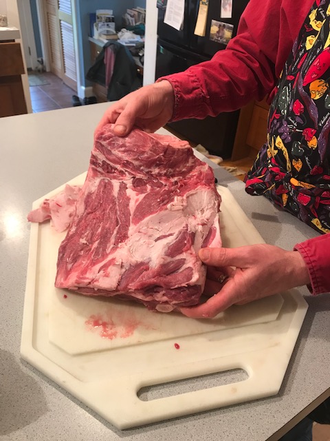 Sourcing the lamb shoulder was a bit challenging. These days, according to the butcher at several local grocery chains, most lamb comes in pre-packaged. That means instead of a whole shoulder, the store is shipped packages of shoulder chops. Just as I decided we would butterfly and grill a leg of lamb instead and only follow the recipe for the braised vegetables and salsa verde, my ever-resourceful husband located a whole lamb shoulder at a more urban meat market not too far away.