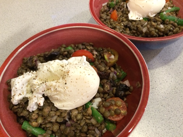 Finally, I made Summer Garden Lentils Niçoise. If I haven’t mentioned it before, lentils are my favorite of all beans and legumes. I’ve seldom met a lentil dish I didn’t like. This lentil salad, which can be served warm or cold, includes my favorite flavors of summer: cherry tomatoes, olives, green beans, and red onion, pulled together with a mustardy vinaigrette. The cherry tomatoes were from my garden and the green beans from a local farm. Eggs transforms the salad to a meal. The first night, I chose to serve it warm with poached eggs on top. Yum! And, then the next day, eggless, this was the perfect side to the zucchini tart I had for lunch. I also liked adding herb stems to the lentils as they cooked. I threw in some basil because I picked too much from the garden. I will definitely make this combination again.