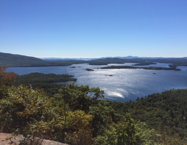 I was at Squam Lake in New Hampshire overnight with a couple of my morning boot camp buddies. This morning, we hiked to the top of Rattlesnake Mountain, and this is the view back over the lake. Gorgeous, no?