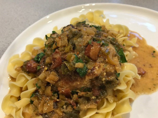 Fortunately, this recipe is really easy and quite delicious. You start out cooking some bacon, then sauté onions in the bacon fat. Then, you brown chicken thighs which have been coated in Dijon mustard. Everything is mixed into some white wine, simmering until the chicken is cooked through. The final touch is stirring in more mustard, both Dijon and seeded, and some crème fraiche to make a creamy sauce.
