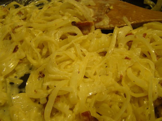 In this incarnation of carbonara, no pasta is involved. Steamed strands of onion stand in for the pasta, though the sauce is classic. Onion carbonara is simple to make. As I said, you steam the sliced onions. And you fry some bacon. After that, the sauce takes just minutes to complete. Melted butter is mixed with the bacon and cream. The onions (aka faux pasta) are warmed in this sauce. Add more cream and an egg yolk and toss to cook the egg. Finally, add some Parmesan cheese and it’s ready to serve.