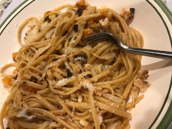 This week for Cook the Book Fridays, we’re making Pasta with Cabbage, Winter Squash, and Walnuts from Dorie Greenspan’s Everyday Dorie. I was unfazed. In an intriguing twist, shredded cabbage stands in for some of the pasta. Long strands of toothsome linguine contrast with the silkier shorter strands of cooked cabbage. Sautéed chunks of butternut squash and sun-dried tomatoes (the original called for dried cranberries, taboo at our house) give the pasta some color. Walnuts and grated Parmesan cheese tie the flavors together.