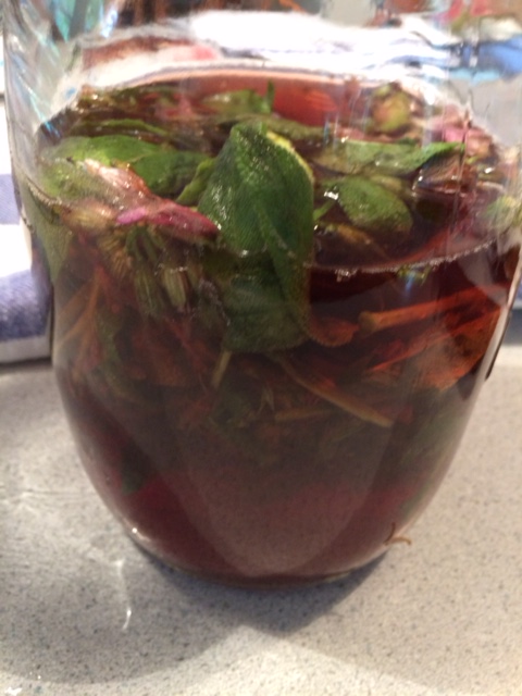 Sage: In addition to the sprigs of sage in my share, the sage plant in my backyard herb garden was flowering. With a plentiful amount of fresh sage ready to go, rather than add it to the week’s meals, I decided to infuse the sage in red wine vinegar for a flavored vinegar to use later.