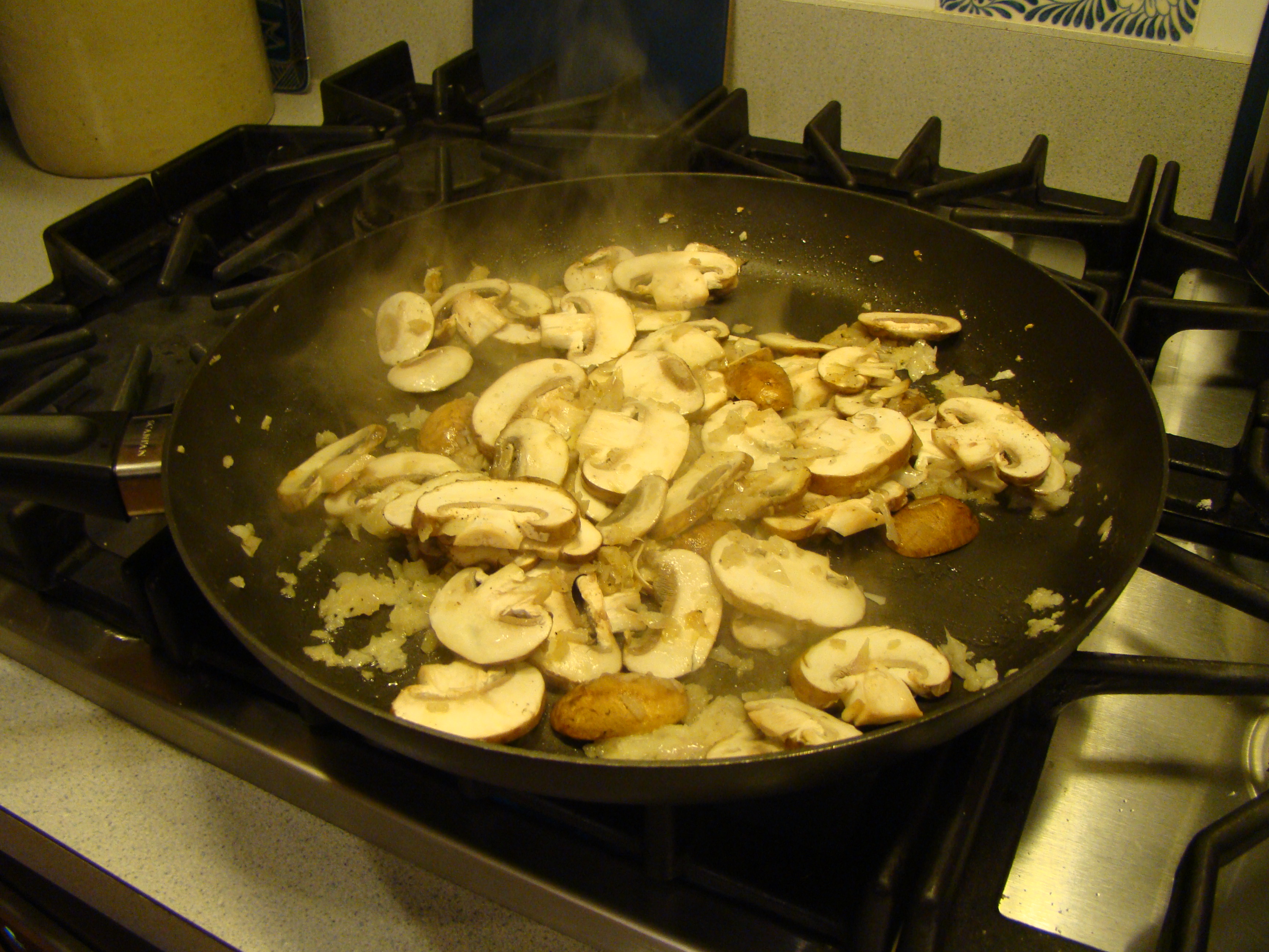 The filling starts with finely chopped shallots sautéed in butter. Then, I added thickly sliced mushrooms. I used cremini mushrooms, which are baby portobellos. They have a deeper, earthier flavor than button mushrooms, and they’re the closest to wild I can afford. The mushrooms developed a lovely caramelized crust as they cooked, adding another layer of flavor. Finally, I stirred some fresh thyme into the mushrooms. The kitchen smelled divine, and the mushrooms tasted the same. I could see quartering the mushrooms and making this part of the recipe as a side dish.