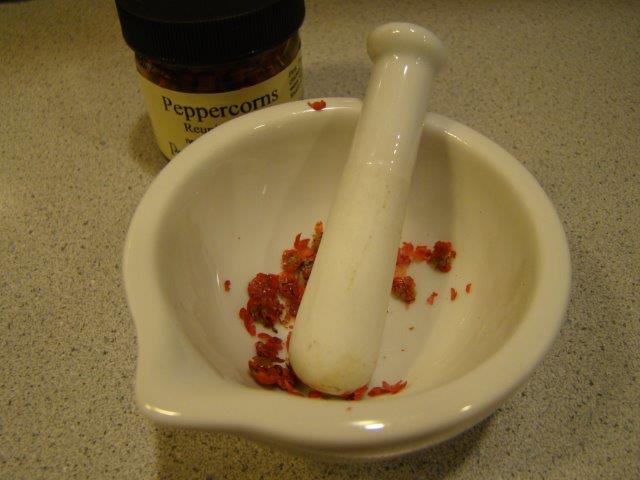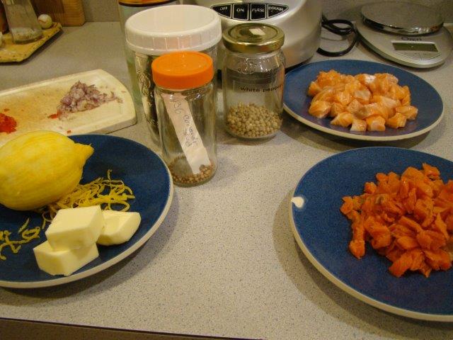 Salmon rillettes is the most colorful of the trio. It’s yet another recipe I’d describe with the word “confetti”. The pale coral of fresh salmon provides the base for flecks of deep coral from smoked salmon, red from a chile pepper, light purple from shallot, a sprinkling of yellow from lemon zest, and a flash of fuchsia from pink peppercorns. The preparation was simple. Small chunks of salmon are barely poached in diluted wine with some lemon peel, a sliver of the chile pepper, and some coriander seed and white peppercorns thrown in the pot. The salmon is then mashed with the other ingredients along with softened butter and lemon juice before packing it into a ramekin to firm up for spreading.