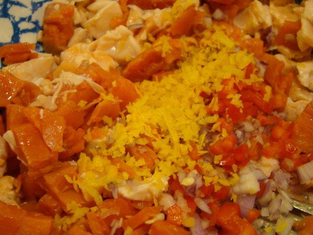 To start, three complementary “salads” are prepared. The first is sliced grape tomatoes tossed with oil and herbs. The second is diced raw salmon tossed with olive oil, more herbs, lime zest, scallion, and Tabasco. Finally, diced avocado is tossed with lime juice and zest, herbs and Tabasco. The final touch is the addition of supremed lime segments to the salmon mixture along with some more lime juice. (And, if you don’t mind supreming that citrus, try my mother’s famous Fruit Salad!)
