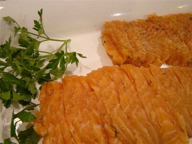 The two styles of gravlax had similar texture and were both delicious. Howard’s “original” version gave off considerably more liquid during the curing process and was firmer than the one prepared Dorie’s way. Dorie’s version was also a little harder to slice thin, probably because it wasn’t quite as firm. We brought half of each half to the party, and there was very little leftover. Both were quite popular with everyone. We’ve been enjoying the salmon we kept for ourselves on bagels with cream cheese in the mornings for the past few days. What a treat!