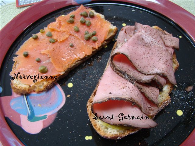 For Version #1, Tartine Norvegienne, the toast is spread with butter, then topped with slices of smoked salmon and sprinkled with capers and a squirt of lemon juice. Yum!
