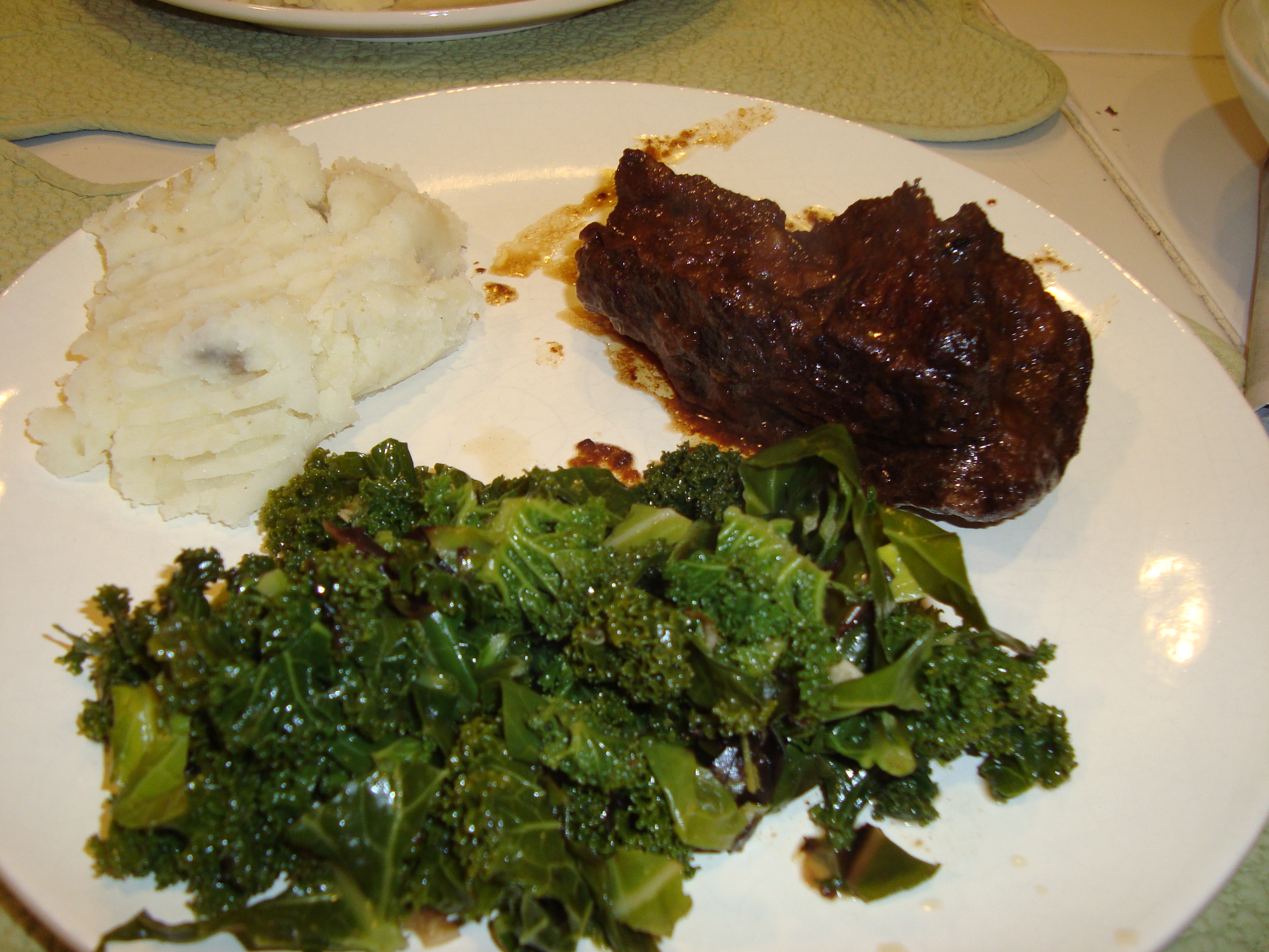 Howard made a great dinner on Sunday. We had some short ribs in the freezer, one big package that we got at a farmers’ market in Maine plus one from Chestnut Farms. Coincidentally, the cover photo on a recent (October 2009) issue of Bon Appetit was of short ribs, providing the necessary inspiration. Officially, the recipe was called Braised Beef Short Ribs with Red Wine Gravy and Swiss Chard. We had all the ingredients in the fridge. Howard also made mashed potatoes. I made substituted kale and collards for the Swiss chard accompanying the ribs. Almost of the vegetables were from our CSA share. It was a very local meal.