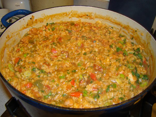 I think my favorite New Orleans dish that I can make at home is jambalaya. (French Market beignets and oyster po-boys would beat jambalaya, but I’m afraid to deep-fry at home.)