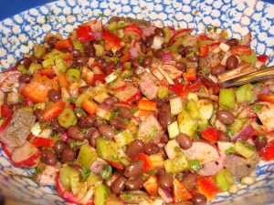 Howard grilled a top round steak from Chestnut Farm. It was a little chewy, not the most tender cut of meat, but tasty. It was a big steak, too big for one meal. With the leftovers, I made this Latin-flavored salad that we always enjoy.