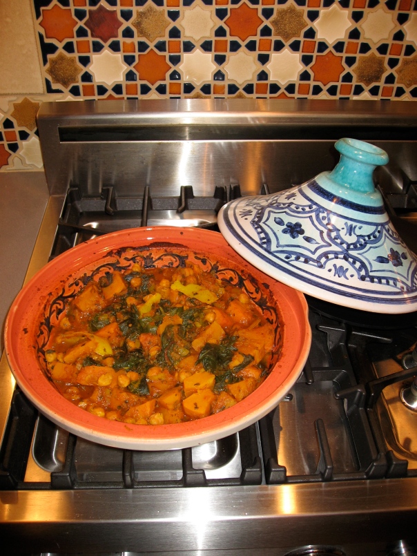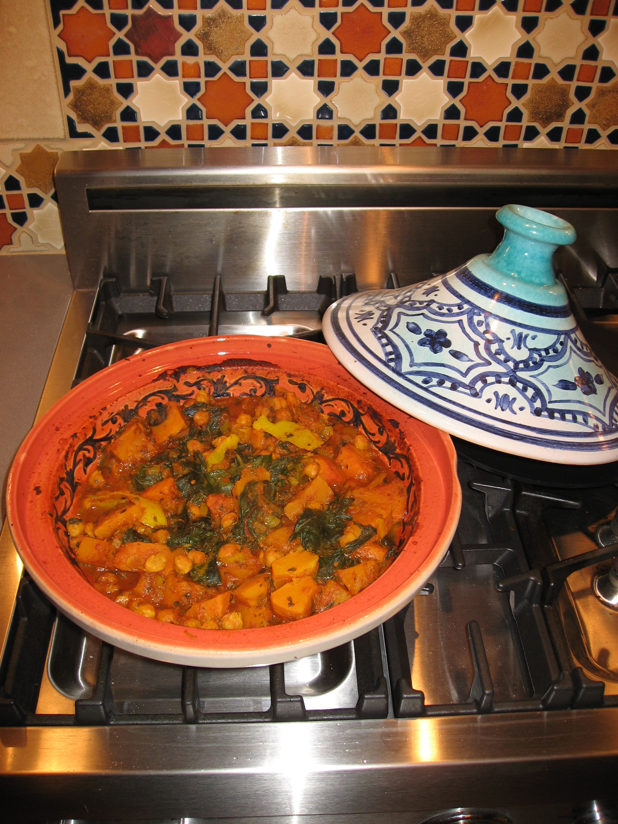 I walked into a charming cookware store called Bram, their website is: http://www.bramcookware.com Lining the shelves were every type of clay cookware imaginable, from France, Italy, and Spain in particular. But the most beautiful pots were the tagines, a Moroccan specialty. The word tagine describes both the clay pot with the peaked lid and the dish that is made in it. I can’t describe the unbelievable colors and designs of these pots. I chatted with one of the owners, Ashrf Almasri, who sources the tagines from a trusted Egyptian pot maker, because he can’t yet guarantee the quality of glazes from Morocco and other countries. He spoke eloquently about how nearly every culture evolved clay containers in which to cook food slowly and directly in a wood fire, and how such cooking connects us to our hunter-gatherer past. He also said that over time clay pots impart a subtle flavoring to food.