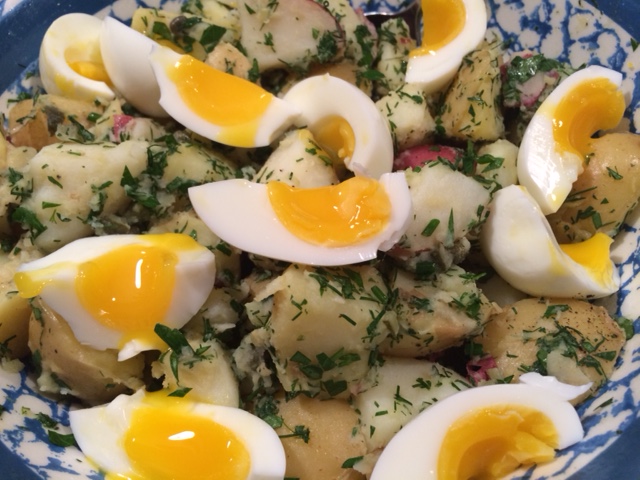 Other than this hiccup, I loved the end result. The contrast of the salty tangy pickles to the fresh verdant flavor of the herbs make a winning combination. I’ll definitely be making the River Cottage version of potato salad again this summer!