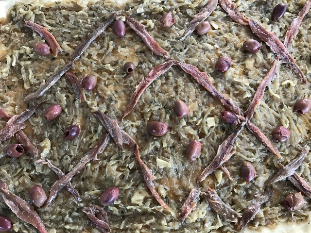 The dough patted out easily to fill the pan. I spread the caramelized onions on top, then had fun arranging anchovies into a crosshatch design and strewing the top with olives.