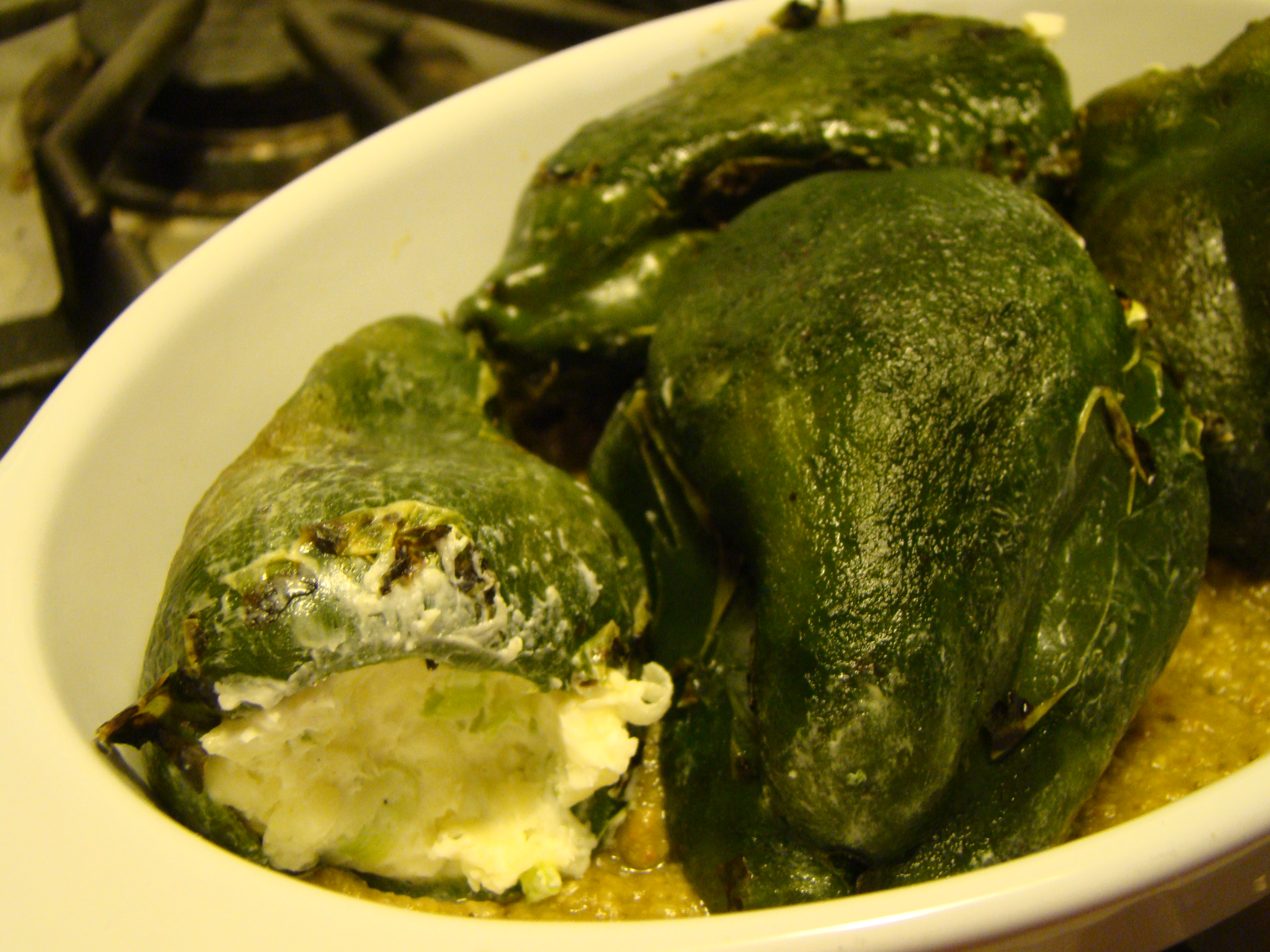 Poblanos were typically on the mild side, but the ones I used this time turned out to be somewhat spicy. The cheese helped. Good thing I didn’t go for the PepperJack cheese that I originally considered. Also, I think I drowned the peppers in too much sauce, though the tastes went together well.