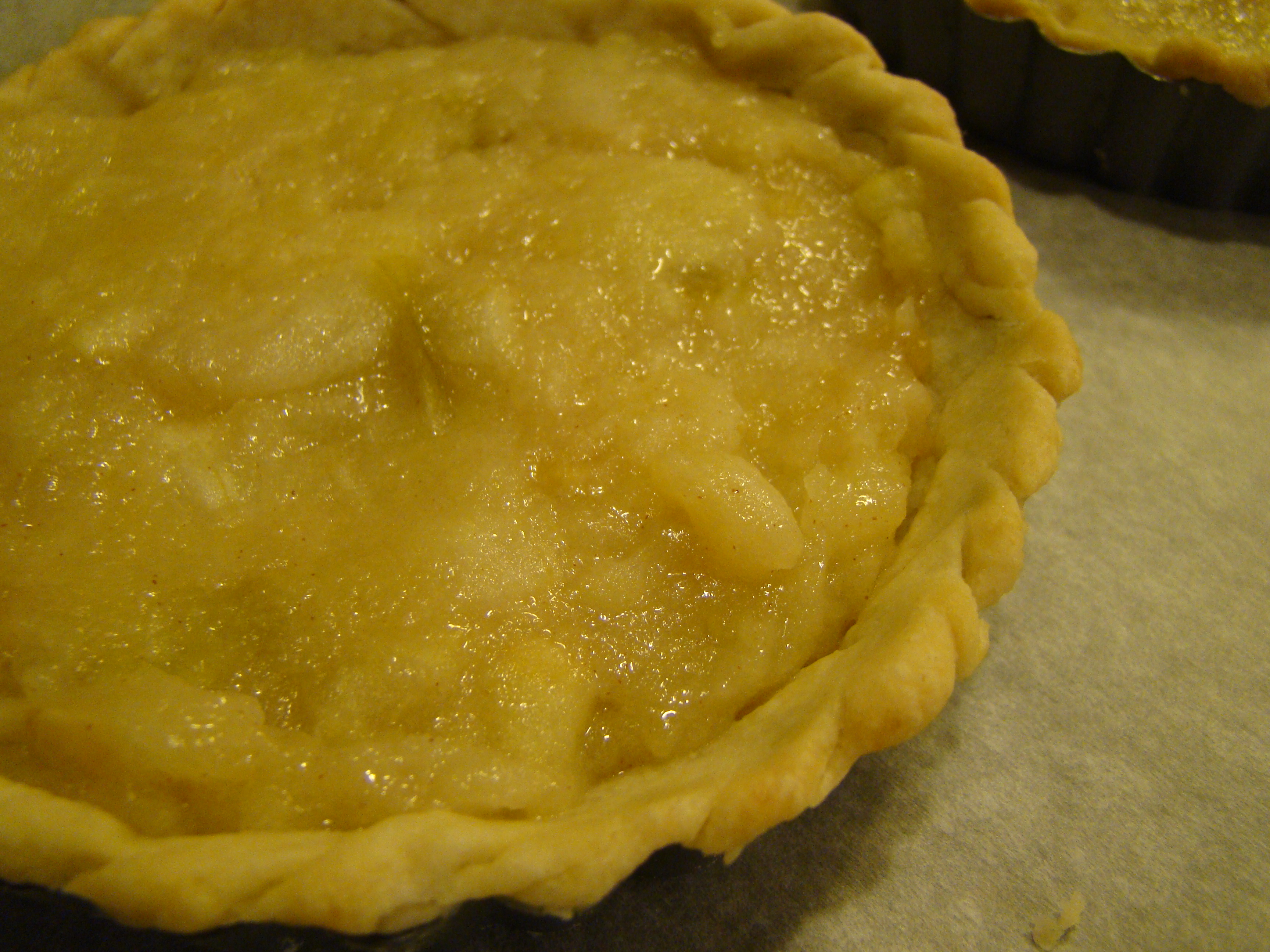 Finally, the filled shells are topped with a circle of thinly sliced apples brushed with melted butter and sprinkled with sugar. The tart is baked until the apples are tender and start to burn on the edges. I was surprised that step took the full baking time for a whole tart even for my mini-tart.