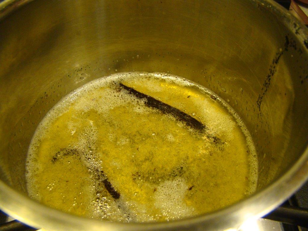 The French Friday recipe, though very simple to prepare, was much more elegant than our usual “lobster in the rough”. First, you clarify some butter. Once clarified, the pulp and pod of a vanilla bean infuses in the butter while the lobster is cooking. Finally, after shelling the lobster to extract the claws and tail, the lobster meat finishes cooking in the vanilla butter bath. The lobster is plated (without all the butter) and sprinkled with fleur de sel and fresh pepper. Simple yet fancy at the same time.