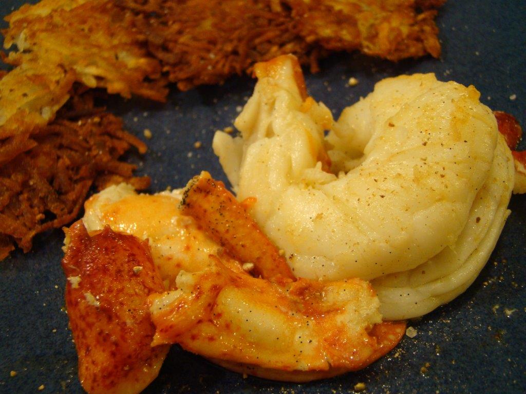 Also, the recipe calls for a pound and a half of butter. We were making about the half the lobster, but even so, I used only 1½ sticks which was plenty to cover all the meat and impart its vanilla flavor. I saved the leftover vanilla butter, and I’m thinking of bathing some cooked shrimp in it to serve over rice for dinner tonight.