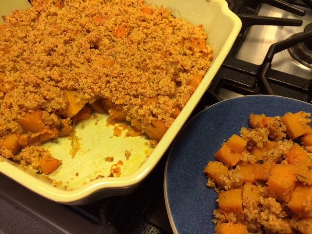 Well, the verdict is that butternut squash crumble is delicious! The tender squash and the crunchy topping works well together. My only quibble is that the two-step cooking of the squash seems fussy. When I make this again, I’ll either saute the squash until it’s completely tender OR roast the vegetable mixture until tender. I’ll skip the other step.