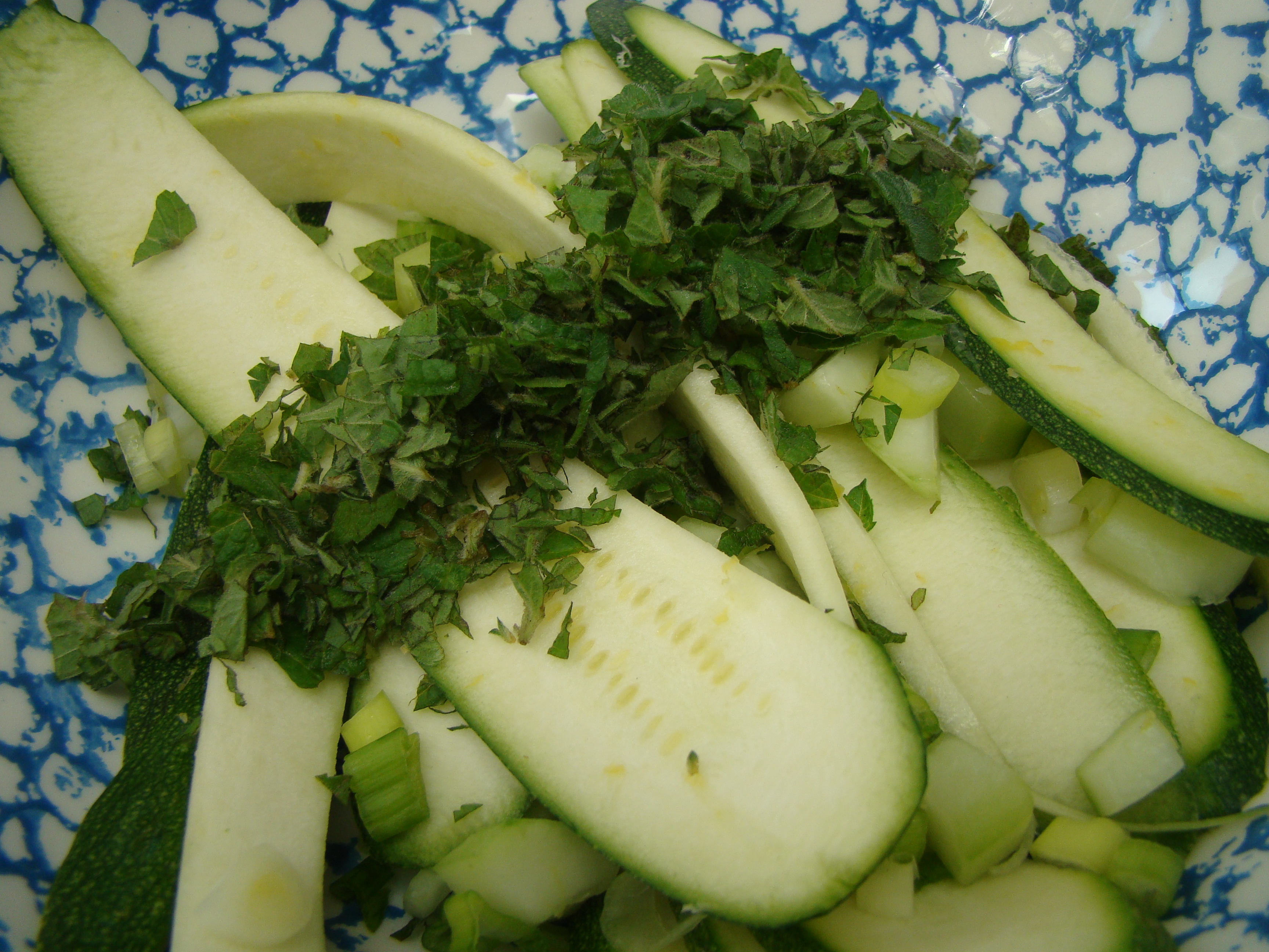 The zucchini is sliced into long planks which are then combined with chopped cucumber, onion (I substituted scallion), and lemon zest, then tossed with a light lemon dressing. The recipe calls for pistachio oil. I didn’t have that, nor did I have time to track it down this week, so I just went with olive oil. The final additions are fresh chopped mint and a healthy dose of pepper.